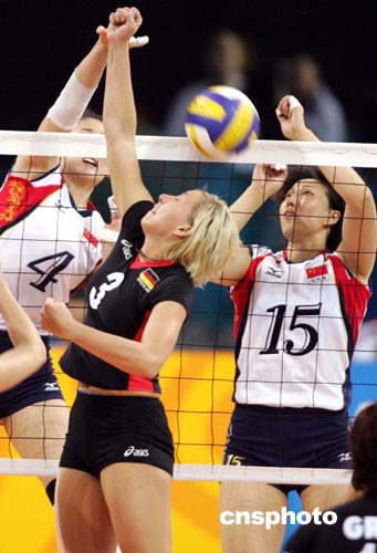 中國(guó)女排當(dāng)?shù)貢r(shí)間八月二十日上午在雅典奧運(yùn)會(huì)排球比賽中以三比零戰(zhàn)勝德國(guó)隊(duì)。中新社記者:毛建軍