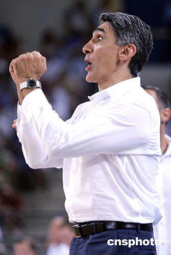在當(dāng)?shù)貢r間8月19日舉行的希臘與立陶宛的籃球比賽中,希臘隊主教練Panagiotis Giannakis不時為隊員精彩表現(xiàn)而歡呼。