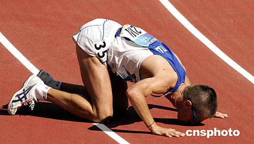 圖為意大利選手布魯格內(nèi)蒂在贏得男子20公里競(jìng)走冠軍后親吻大地的場(chǎng)面。
