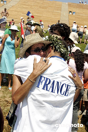 在當(dāng)?shù)貢r(shí)間8月20日舉行的急流回轉(zhuǎn)男子單人皮艇決賽中,法國(guó)選手勒弗維里獲得銅牌。圖為他與自己的母親互相擁抱慶祝勝利的畫(huà)面。