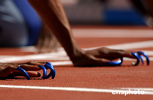 美國“女飛人”蓋爾-德弗斯第五次出征奧運(yùn)會(huì),她曾在25屆和26屆奧運(yùn)會(huì)上連續(xù)贏得100米短跑金牌。圖為她的那個(gè)起跑前獨(dú)一無二的預(yù)備動(dòng)作——用手背貼地而彎起長長的美麗指甲。