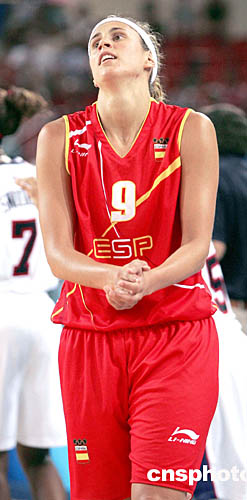 圖為當地時間8月20舉行的女子籃球賽中,西班牙隊員在球隊不敵美國隊后扼腕痛惜。