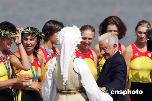 當(dāng)?shù)貢r(shí)間八月二十二日,國際奧委會前主席薩馬蘭奇出席賽艇比賽頒獎(jiǎng)儀式。中新社記者:毛建軍