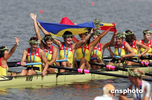 當?shù)貢r間八月二十二日,羅馬尼亞隊獲得雅典奧運女子八人單槳有舵手賽艇比賽金牌。中新社記者:毛建軍