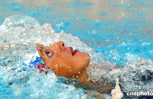 在當(dāng)?shù)貢r(shí)間8月20日進(jìn)行的女子200米仰泳比賽中,俄羅斯選手Stanislava Komarova獲得銀牌。圖為她在比賽中的表現(xiàn)。