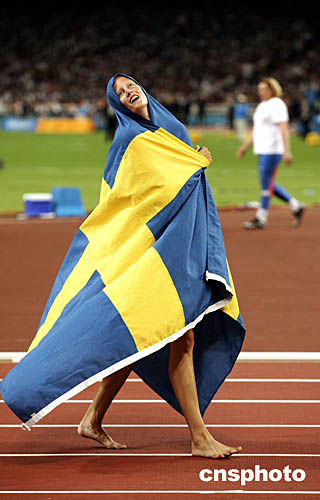 圖為瑞典選手克魯夫特(Kluft Carolina)在獲得女子七項(xiàng)全能冠軍后,身披國(guó)旗以示慶祝的畫面。