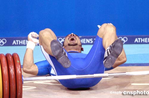 圖為85公斤級(jí)男子舉重比賽銅牌得主希臘選手迪馬斯在比賽中。