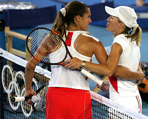 在當(dāng)?shù)貢r間8月21日舉行的女子網(wǎng)球賽中,比利時小將海寧戰(zhàn)勝法國名將毛瑞斯莫折桂。圖為賽后兩名選手非常友好的擁抱。