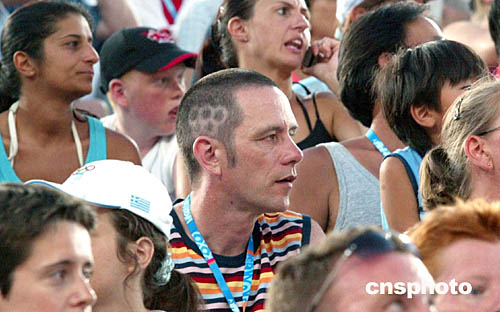 圖為一名觀眾的頭上剃了個(gè)奧運(yùn)五環(huán)的圖,非常醒目。
