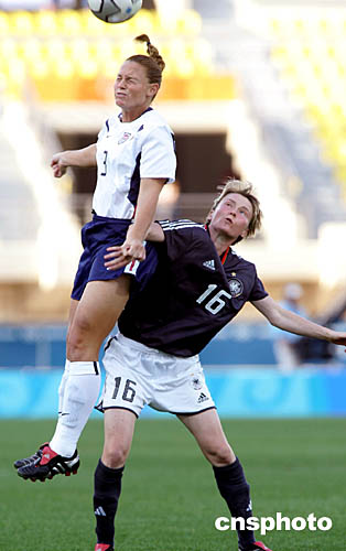 圖為在當?shù)貢r間8月23日的女足比賽中,美國隊3號選手Christie RAMPONE頭球出色。