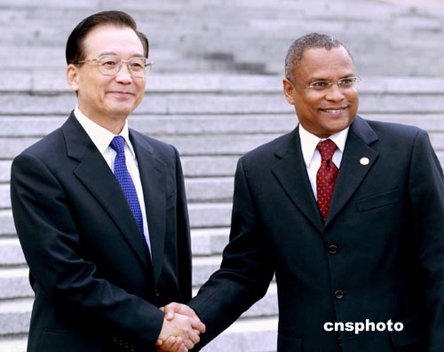 中新社北京八月二十四日電 (記者 朱大強)中國國務(wù)院總理溫家寶今天在人民大會堂與佛得角總理內(nèi)韋斯舉行會談,雙方一致表示愿共同努力,推動兩國關(guān)系全面發(fā)展。