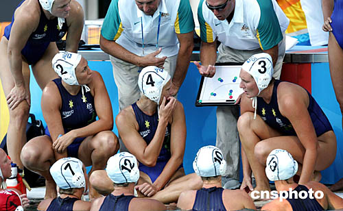 圖為在女子手球比賽現(xiàn)場(chǎng),教練在現(xiàn)場(chǎng)部署戰(zhàn)術(shù)。最后希臘隊(duì)?wèi)?zhàn)勝澳大利亞隊(duì)挺進(jìn)決賽。