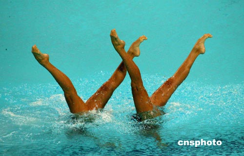 當(dāng)?shù)貢r(shí)間8月24日晚,加拿大隊(duì)在雅典奧運(yùn)會(huì)進(jìn)行雙人花樣游泳比賽。中新社記者:王瑤