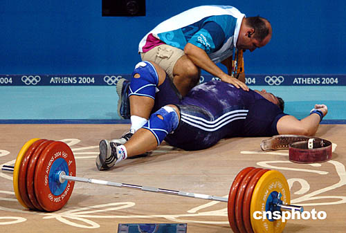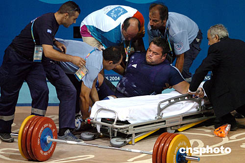 圖為在當(dāng)?shù)貢r間8月25日舉行的男子舉重比賽中,挪威選手STAIN GRIMSETH不慎膝蓋受傷,醫(yī)護(hù)人員緊急把他抬出場地。