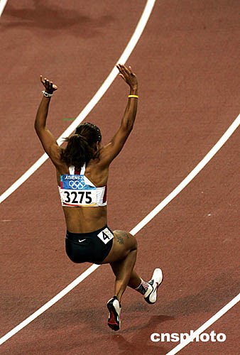 圖為獲得女子百米欄的美國(guó)選手海斯·喬安娜(HAYES Joanna)在沖過(guò)終點(diǎn)后的鏡頭。