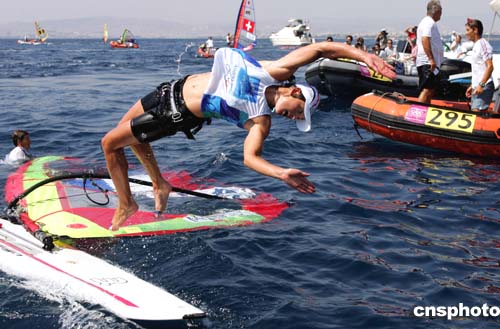 在當(dāng)?shù)貢r(shí)間8月25日進(jìn)行的女子帆船帆板米斯特拉級比賽中,法國選手馬萊特奪取金牌。
