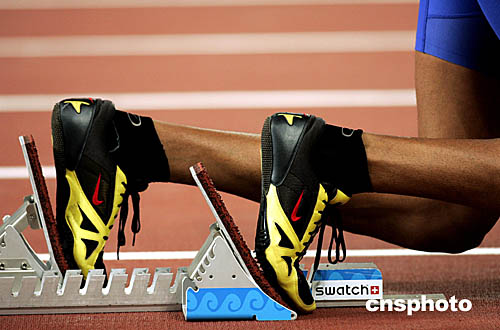 圖為在田徑場上進(jìn)行的200米比賽時(shí),選手起跑前對(duì)腳部的鏡頭特寫。