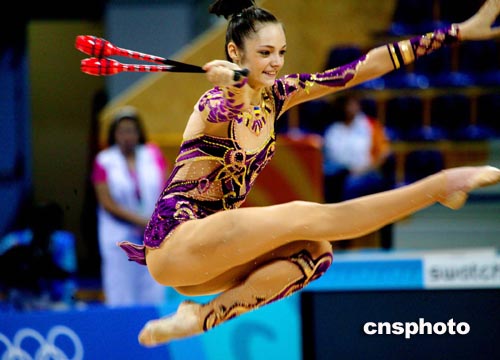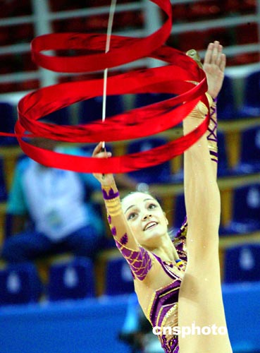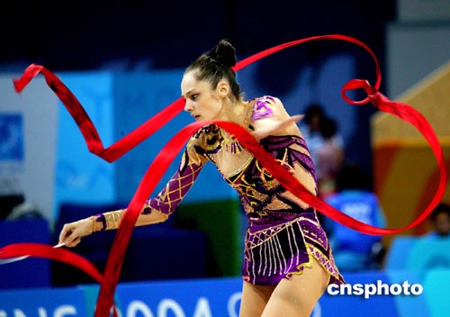 雅典當?shù)貢r間八月二十五日,俄羅斯藝術(shù)體操個人全能選手KABAEVA進行奧運會賽前排練。中新社記者:王瑤