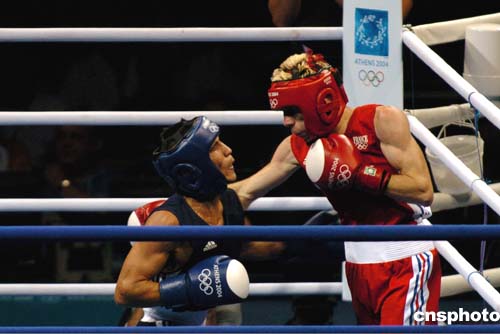 圖為當(dāng)?shù)貢r間25日進行的拳擊四分之一決賽中,法國選手Jerome Thomas力拼對手的場面。