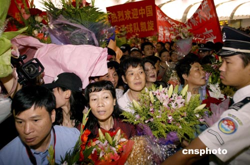 8月26日,北京首都國(guó)際機(jī)場(chǎng)又迎來(lái)一批載譽(yù)歸來(lái)的奧運(yùn)健兒,包括羽毛球、乒乓球、游泳、體操、舉重等200多名選手,他們?cè)跈C(jī)場(chǎng)受到英雄般的歡迎,幾乎每個(gè)人都被鮮花包圍。這是大批民眾在機(jī)場(chǎng)手持鮮花、歡迎條幅翹首等待奧運(yùn)健兒凱旋。中新社記者:盛佳鵬