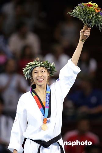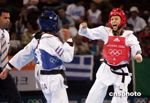 當(dāng)?shù)貢r(shí)間八月二十六日晚,在雅典奧運(yùn)會(huì)女子四十八公斤級(jí)跆拳道決賽中,中國(guó)臺(tái)北選手陳詩(shī)欣獲得金牌。這是中國(guó)臺(tái)北代表團(tuán)在奧運(yùn)歷史上的首枚金牌。中新社記者:毛建軍
