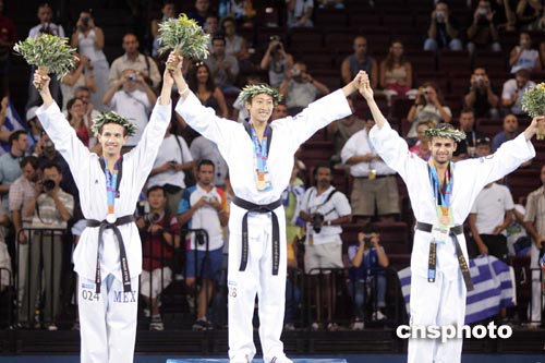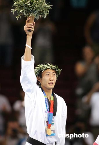 當(dāng)?shù)貢r(shí)間八月二十六日晚,在雅典奧運(yùn)會(huì)男子五十八公斤級(jí)跆拳道決賽中,中國(guó)臺(tái)北選手朱木炎戰(zhàn)勝墨西哥選手SALAZAR獲得金牌。中新社記者:毛建軍