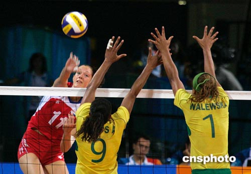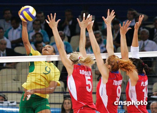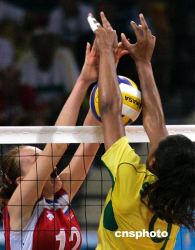 北京時間8月27日凌晨,俄羅斯女排(紅衫)在雅典奧運會女排半決賽中,在先失兩局的情況下反敗為勝,以3比2淘汰強勁對手巴西隊進入決賽。中新社記者:張煒