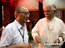 八月二十七日“黃賓虹國際學術(shù)研討會”在北京開幕。著名畫家邵大箴(左)與臺灣著名藝術(shù)家李奇茂(右)出席“黃賓虹國際學術(shù)研討會”。作者:王磊