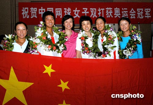 在雅典奧運會網(wǎng)球女子雙打決賽中為中國獲得歷史上首枚網(wǎng)球金牌的李婷、孫甜甜,回國后立即成為人們的偶像,交際活動頻繁。圖為新任國家體育總局網(wǎng)球運動管理中心主任孫晉芳(右三)和她的老女排隊友楊希(左三),帶著李婷(左二)、孫甜甜(右二)在參加一個歡迎宴前合影留念。作者:王麗南