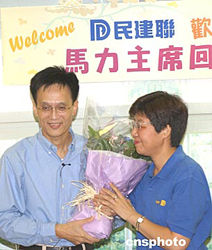 民建聯(lián)主席馬力早時在內(nèi)地接受切除結(jié)腸癌手術(shù)﹐28日出院返回香港﹐民建聯(lián)中常委在總部設(shè)歡迎會﹐歡迎馬力主席手術(shù)成功返港﹐蔡素玉向馬力送花。中新社記者:趙振清