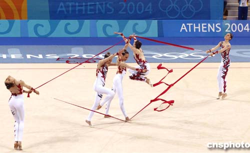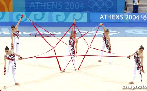 圖為意大利隊(duì)在藝術(shù)體操集體全能比賽中的精彩表現(xiàn),她們獲得該項(xiàng)目的銀牌。