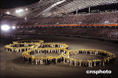 圖為在雅典閉幕式上,表演者一起組成了奧運五環(huán)的標志。