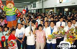 代表團(tuán)今天中午返抵機(jī)場(chǎng),雅典奧運(yùn)贏得乒乓球男雙銀牌的高禮澤及李靜亦隨隊(duì)抵港,三百多名熱愛(ài)乒乓球的小朋友,獲安排到機(jī)場(chǎng)迎接,高禮澤及李靜的父母,以及民政事務(wù)局長(zhǎng)何志平、康文署長(zhǎng)王倩儀等官員,亦到機(jī)場(chǎng)迎接。