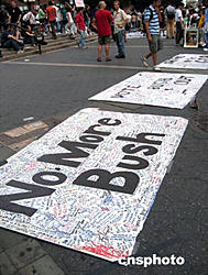 九月二日下午,在曼哈頓中城聯(lián)合廣場(chǎng)公園內(nèi),鋪著“把布什選下去”的標(biāo)語,希望征集行人簽名。美國總統(tǒng)大選臨近,恰逢共和黨全國代表大會(huì)正在紐約舉行,民眾在市內(nèi)公園里舉行很多自發(fā)的反戰(zhàn)、反布什示威活動(dòng)。作者:江雪晴