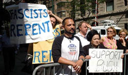 美東時(shí)間九月二日,美國(guó)總統(tǒng)布什來(lái)到紐約曼哈頓,準(zhǔn)備出席在這里舉行的共和黨全國(guó)代表大會(huì)閉幕式。當(dāng)總統(tǒng)車隊(duì)經(jīng)過(guò)被全線封鎖的市中心街道時(shí),路邊一位婦人打著“支持布什”的標(biāo)語(yǔ)。但他身邊的男子展開更寬大的橫幅,上書“法西斯分子該悔悟了”。作者:龔文謨