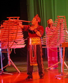 竹制樂器的演奏是越南藝術(shù)表演中獨(dú)具特色的,竹琴據(jù)介紹是仿鋼琴制成的,音色清脆,節(jié)奏明快,表演者的雙手在竹鍵上彈奏,速度快得讓觀眾眼花繚亂;德朗琴是用線將長短不一的竹筒自上而下排掛在一個琴架上,敲擊琴筒的兩根細(xì)棒頂端各固定一個圓球,球上罩著一層布,敲擊竹筒時琴聲似幽谷回響;klong put琴由一排粗細(xì)有別的竹筒制成,演奏者根據(jù)每個竹筒的固定音調(diào),用手在筒端變換敲擊出舒緩綿長的曲調(diào)來;還有一個孔的簫,遠(yuǎn)遠(yuǎn)看去吹蕭人將蕭橫托在面前,用手在蕭的遠(yuǎn)端一開一合地掌握音階,仿佛中國蕭從小孔開合變換里發(fā)出的聲音,都從越南吹蕭人的手中魔幻般地變了出來。這些樂器既有獨(dú)奏,又有合奏,兼有表演的觀賞與聽覺的雙重效果,極具藝術(shù)魅力。