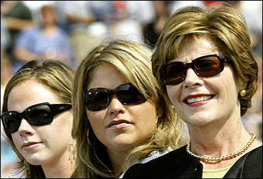 中新網(wǎng)9月5日電 據(jù)法新社報(bào)道,美國總統(tǒng)布什的家人,他的兩個(gè)雙胞胎女兒芭芭拉(左)、簡娜(中)以及妻子勞拉在布什在賓夕法尼亞州一個(gè)老兵紀(jì)念館里面對(duì)觀眾演講時(shí)在一旁為他助威。(固山)