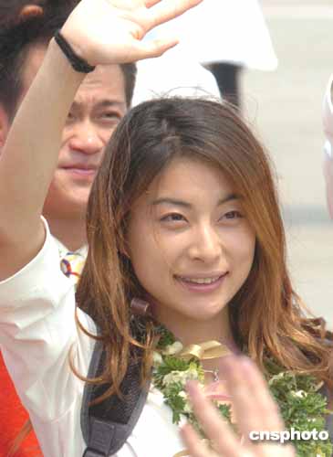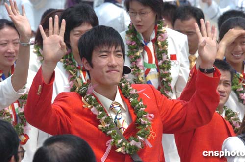 代表團(tuán)在十一時十五分左右由袁偉民帶領(lǐng)下走出機(jī)艙,緊隨其后的是奧運(yùn)一百一十米跨欄金牌得主劉翔、跳水公主郭晶晶、跳水王子田亮、“蛙后”羅雪娟等廣受香港市民歡迎的運(yùn)動員。男運(yùn)動員身穿整齊和耀目的西裝,女運(yùn)動員則身著大方得體的外套和裙子,他們頸上掛著花環(huán),顯得精神抖擻,不斷向在場歡迎人士露出燦爛的笑容并揮手致意。