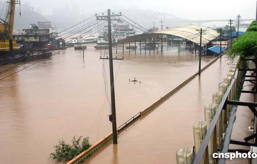 不斷上漲的江水將山城多處變成了“澤國(guó)”。在朝天門水上派出所,大門被洪水淹過一米多深,門口數(shù)百個(gè)沙袋被沖得七零八落。一青年手持叉網(wǎng)站在齊腰深的水中,一會(huì)兒工夫竟網(wǎng)起不少活蹦亂跳的魚蝦。據(jù)派出所工作人員介紹,這是朝天門廣場(chǎng)建成以來(lái)遭遇的最大一次洪峰。