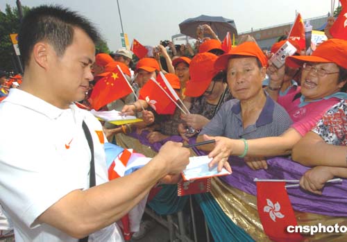 國家奧運(yùn)金牌代表團(tuán)9月7日在香港展開觀光之旅,在抵達(dá)灣仔金紫荊廣場(chǎng)參觀時(shí),吸引大批市民圍觀,圖為舉重金牌選手張國政為熱情的香港市民簽名。作者:趙振清