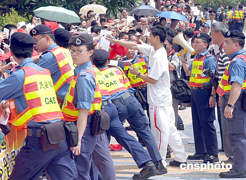 | 國家奧運(yùn)金牌代表團(tuán)9月7日在香港展開觀光之旅,金牌選手分別在香港多處名勝景點(diǎn)參觀,所到之處均深受廣大市民熱烈歡迎,在雅典奧運(yùn)勇奪跳水男子雙人10米高臺(tái)金牌的“跳水王子”田亮在尖沙咀星光大道參觀,并為小學(xué)生簽名留念,在場民安隊(duì)員加強(qiáng)護(hù)欄。作者:鄧慶樂