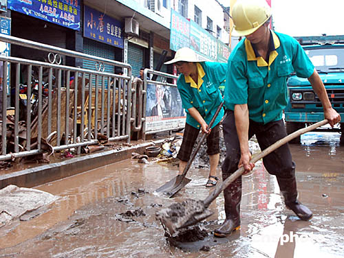 重慶開縣洪水退去 環(huán)衛(wèi)工人清除街道淤泥