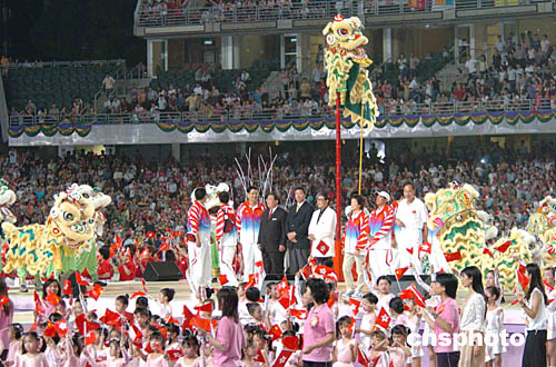 隨著金龍飛舞、銀獅歡躍,第一輛載著奧運(yùn)金牌選手的高爾夫球車駛?cè)胂愀鄞笄驁?chǎng),“中國(guó)人的驕傲──奧運(yùn)金牌精英大匯演”,在逾三萬觀眾雷鳴潮涌般的歡呼聲中拉開了帷幕。中國(guó)奧運(yùn)金牌選手與香港當(dāng)紅演藝明星的夢(mèng)幻組合,使今晚的香港大球場(chǎng)成為激情四溢、歡樂無盡的海洋。