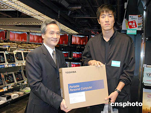 國(guó)家奧運(yùn)選手在香港展開訪港行程,9月8日,部分金牌選手到尖沙咀海港城海洋中心選購(gòu)總值十多萬元電器產(chǎn)品。圖為劉翔與百老匯代表合影。作者:洪少葵