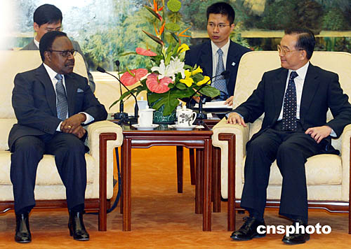 溫家寶今天下午在人民大會堂會見了到訪的加蓬總統(tǒng)邦戈。他高度評價中加關(guān)系,稱贊加蓬是中國在非洲的可靠朋友。他表示,中加經(jīng)貿(mào)合作已有良好的基礎(chǔ),合作前景廣闊,希望雙方進(jìn)一步挖掘潛力,提高合作規(guī)模和質(zhì)量,加強(qiáng)在經(jīng)濟(jì)技術(shù)、貿(mào)易和人才培訓(xùn)等方面的合作。
