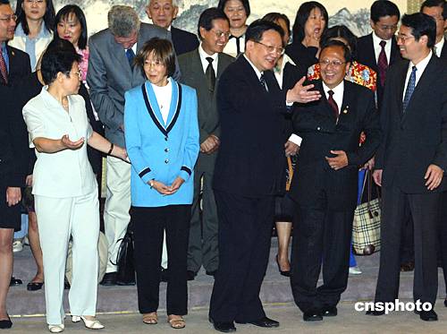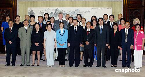 九月十日,國務(wù)委員唐家鏇在北京中南海紫光閣會見美加參政華人訪華團全體成員。國務(wù)院僑辦主任陳玉杰(左前一)、副主任許又聲(右前一)陪同會見。中新社記者:鄭萍萍