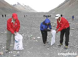“2004地球第三極珠峰環(huán)保大行動(dòng)”的志愿者隊(duì)伍在九月十日中午十一點(diǎn)左右抵達(dá)了海拔五千一百六十米的珠峰大本營后,環(huán)保隊(duì)開始進(jìn)行為期三天的珠峰清掃工作。這次清掃的主要對(duì)象是登山愛好者們丟棄的生活垃圾、廢氧氣瓶、廢棄帳篷等。隊(duì)員們的行動(dòng)影響了在珠峰大本營駐扎的各國登山愛好者,他們紛紛加入到清掃隊(duì)伍中。作者:范曉麗