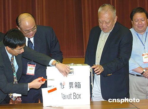 行政長官董建華與選舉管理委員會主席胡國興﹑民政事務局局長何志平12日晚到位于跑馬地黃泥涌道禮頓山社區(qū)會堂點票開箱點票。