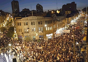 中新網(wǎng)9月13日電 據(jù)以色列《耶路撒冷郵報(bào)》報(bào)道,當(dāng)?shù)貢r(shí)間9月12日晚,數(shù)萬(wàn)名以色列人先后涌上首都耶路撒冷的街頭,舉行了一場(chǎng)聲勢(shì)浩大的示威活動(dòng),對(duì)以色列總理沙龍?zhí)岢龅拿髂昴甑浊皬募由车貛С奋娪?jì)劃提出強(qiáng)烈抗議。