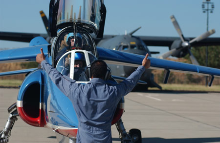 | 法國(guó)空軍的“法蘭西巡邏兵”飛行表演隊(duì)正式成立于1964年2月。飛行表演隊(duì)的飛機(jī)涂著同法國(guó)國(guó)旗一樣的紅、白、藍(lán)三種顏色,機(jī)群在空中做飛行表演時(shí)也常常把著三種顏色的煙跡留在空中。它象征著“自由”(紅色)、“民主”(白色)、“博愛”(藍(lán)色),體現(xiàn)了法國(guó)人民勇敢、浪漫的傳統(tǒng)和對(duì)未來美好的愿望。圖為在地勤人員指示下飛行員把飛機(jī)駛到指定位置(來源:艦船知識(shí)網(wǎng)絡(luò)版)